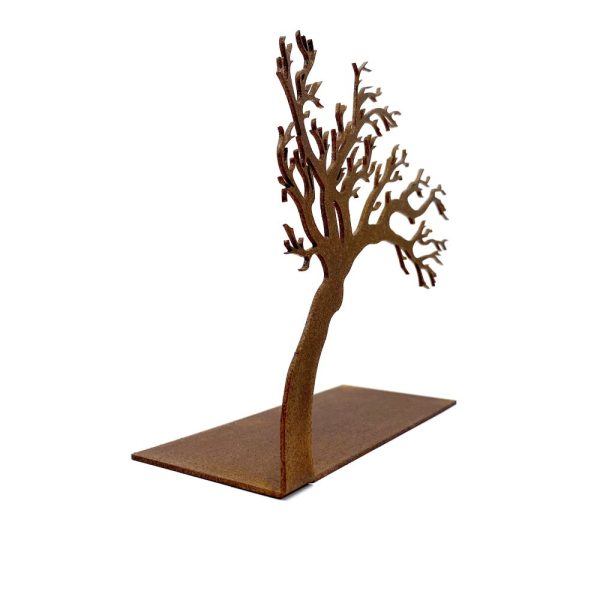 Pieza decorativa realizada en hierro oxidado inspirada en el efecto constante de la Tramuntana sobre un árbol.