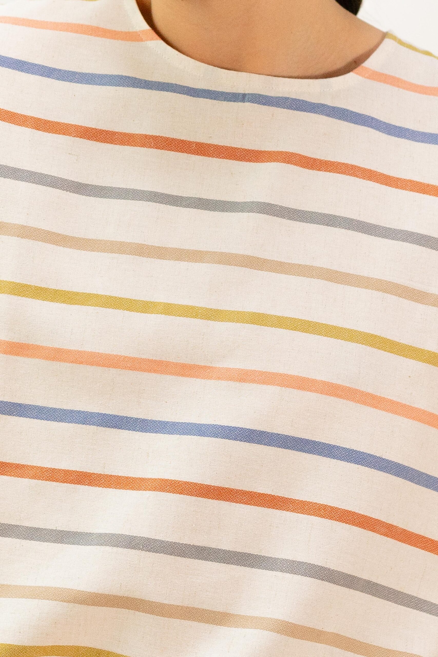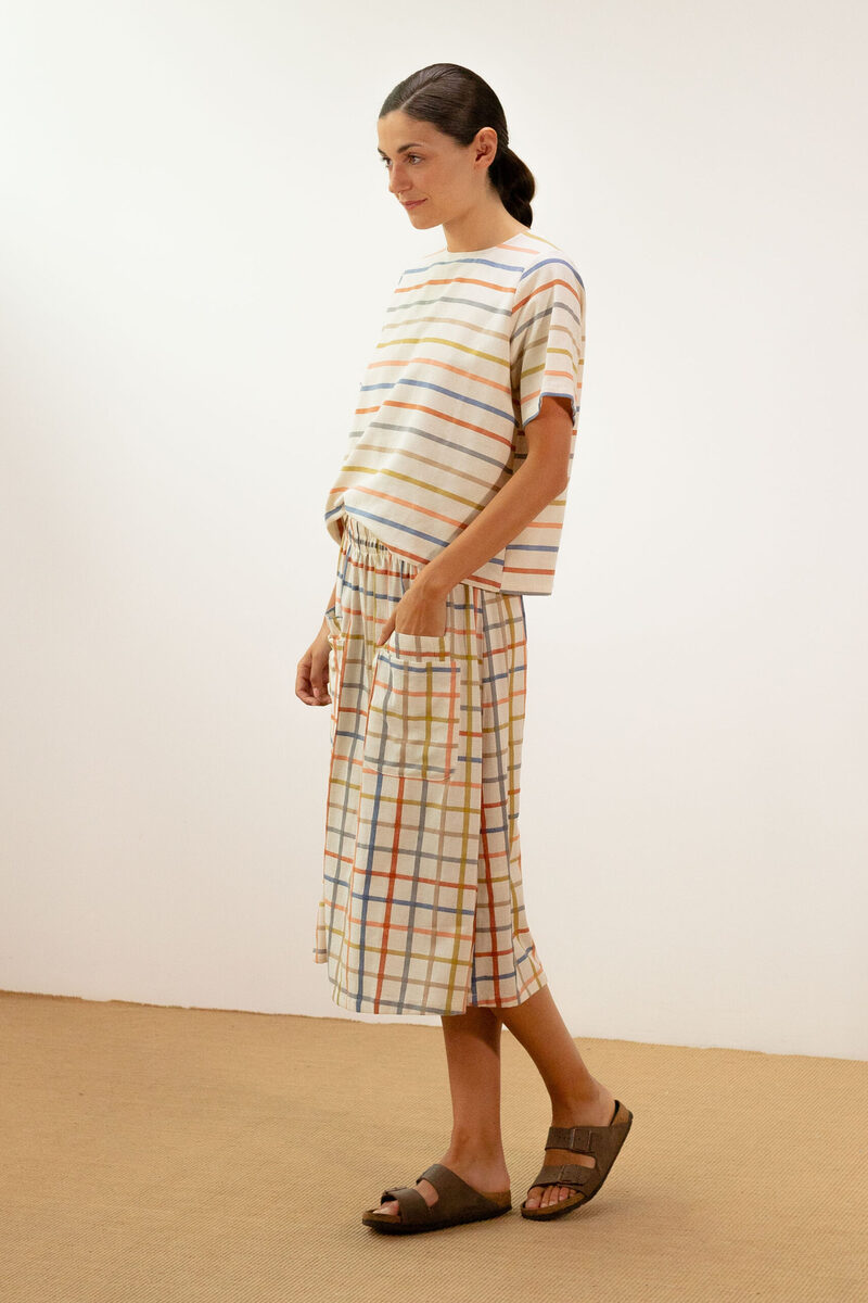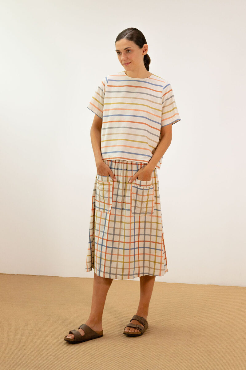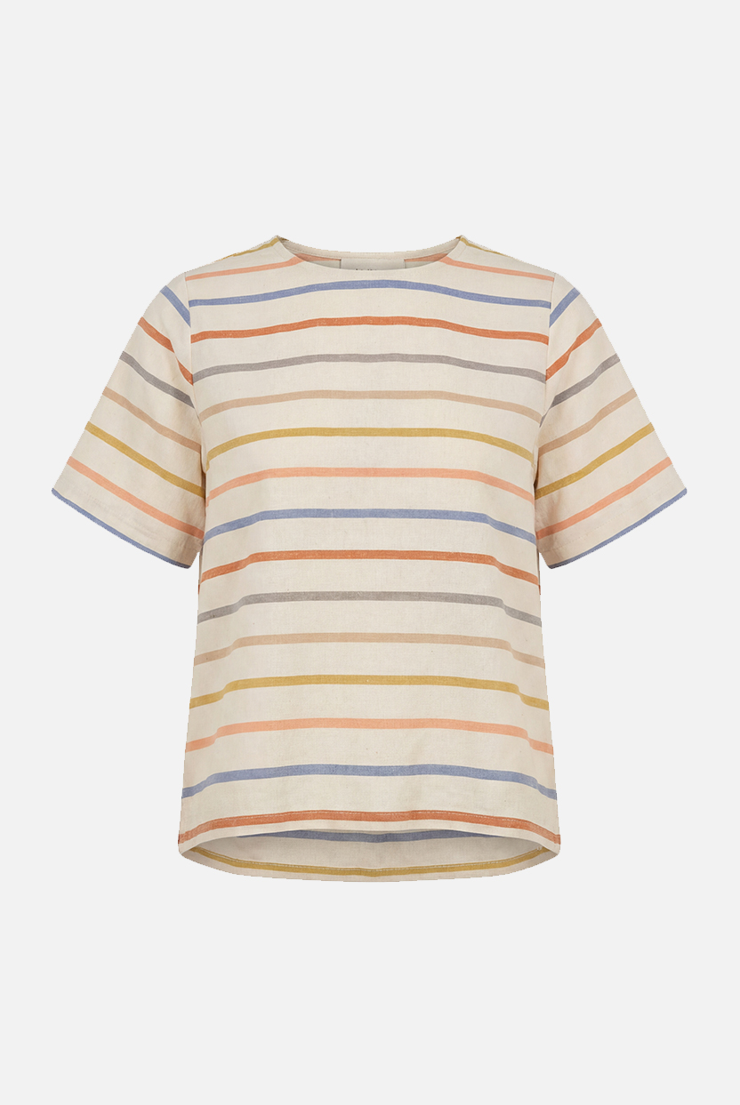 Blusa de manga corta con tela de rayas. Tiene un patrón recto, manga corta y escote de cuello redondo. Perfecta para llevar con la falda a juego, vaqueros o pantalones de lino blanco.