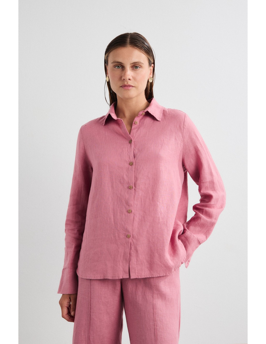 Camisa básica de lino con cuello camisero, botonadura frontal, puños con botón, canesú en la espalda y pliegue central. Incluye un botón oculto en la costura lateral que permite llevarla cruzada, ofreciendo una silueta versátil y sofisticada. Combínala con los pantalones Aurora.