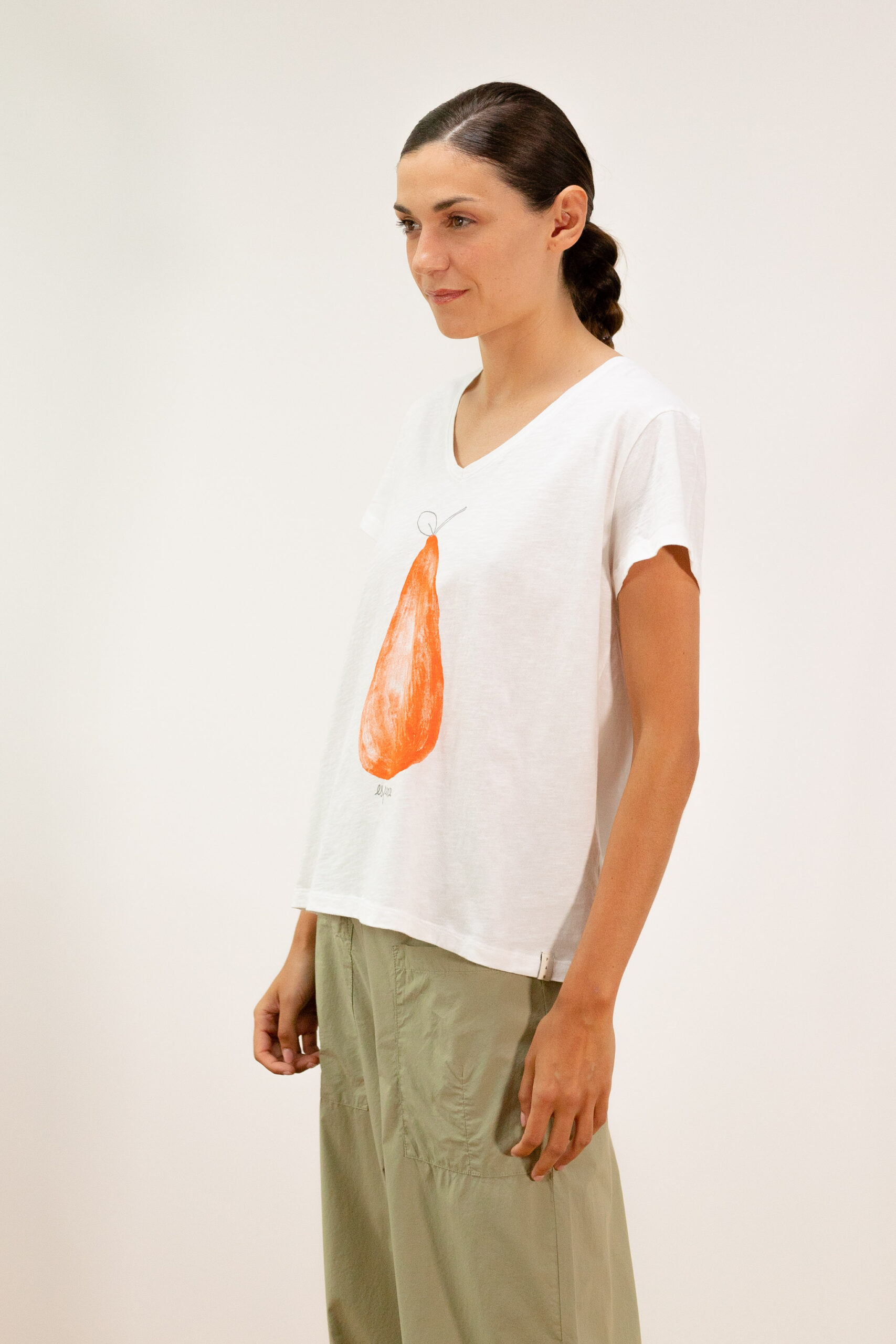 Camiseta blanca de algodón orgánico con estampado Pera. Tiene un patrón amplio con caída, manga corta de estética casual y escote de cuello de pico. Perfecta para llevar con pantalones vaqueros o bermudas