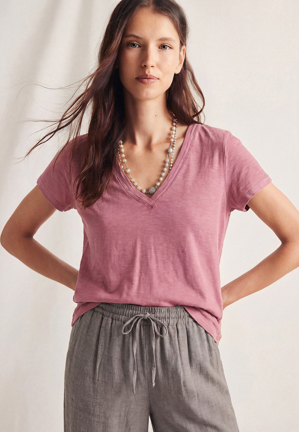 Camiseta 100% algodón, escote en pico y manga corta.