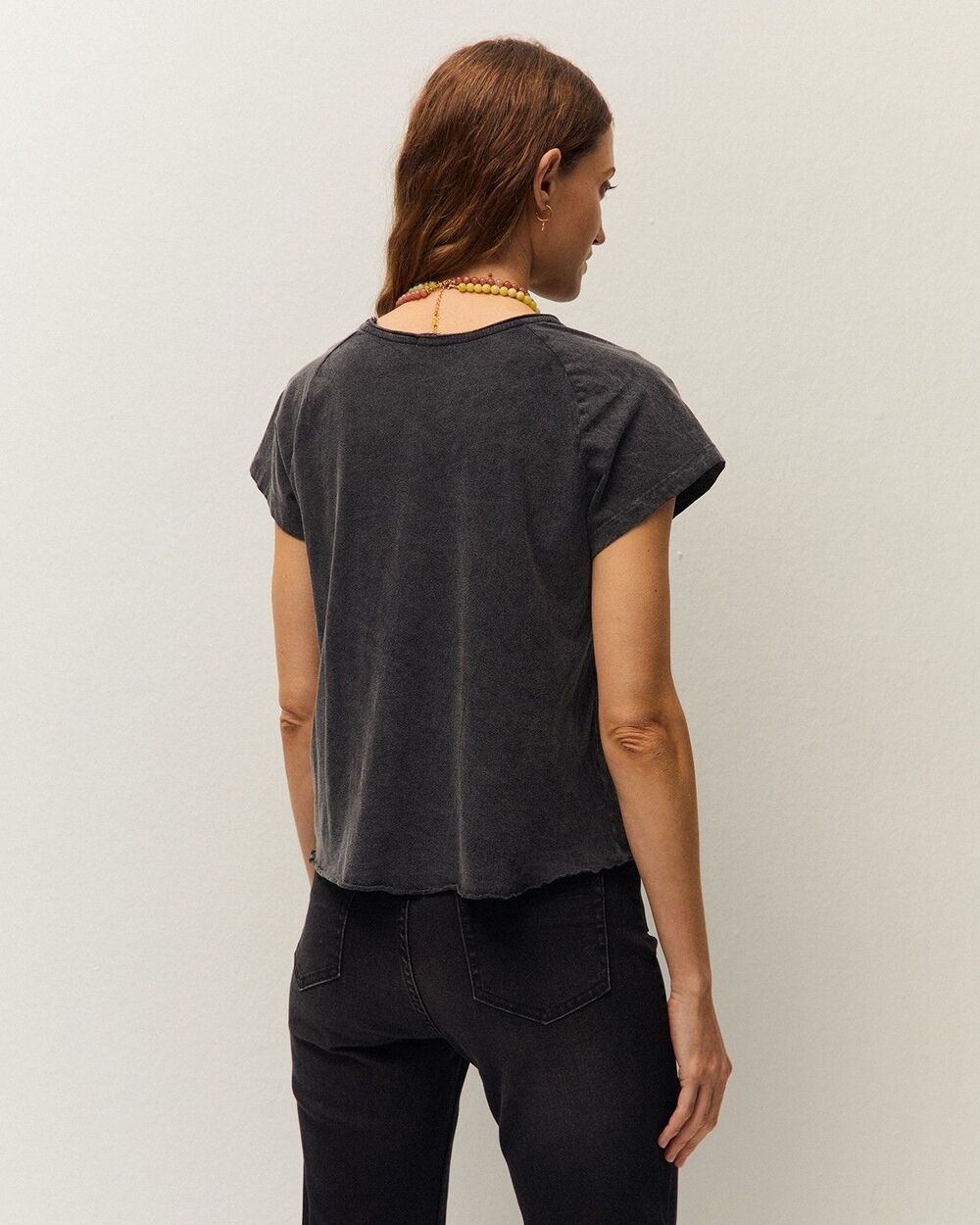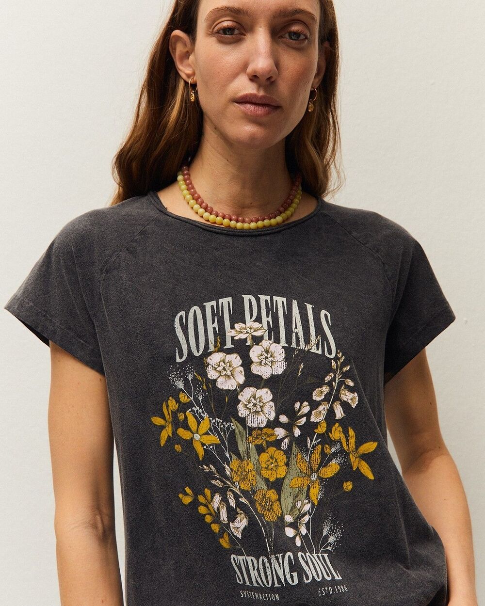 Camiseta de manga corta y cuello redondo, con print posicional en el delantero y tinte corrosivo. Prenda sostenible.