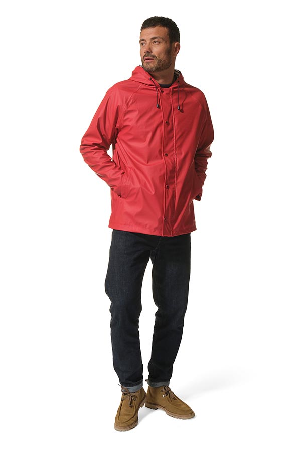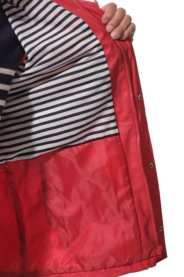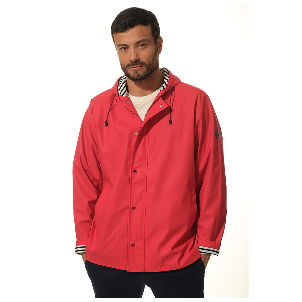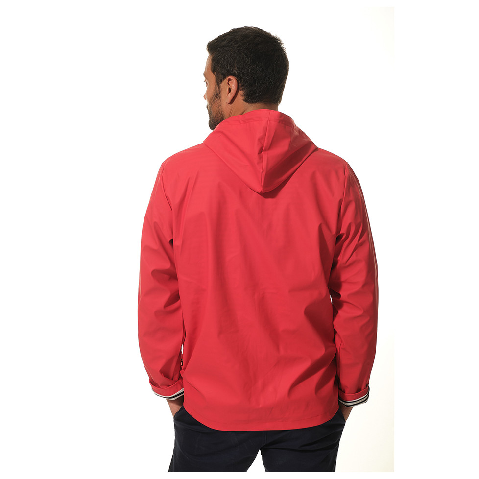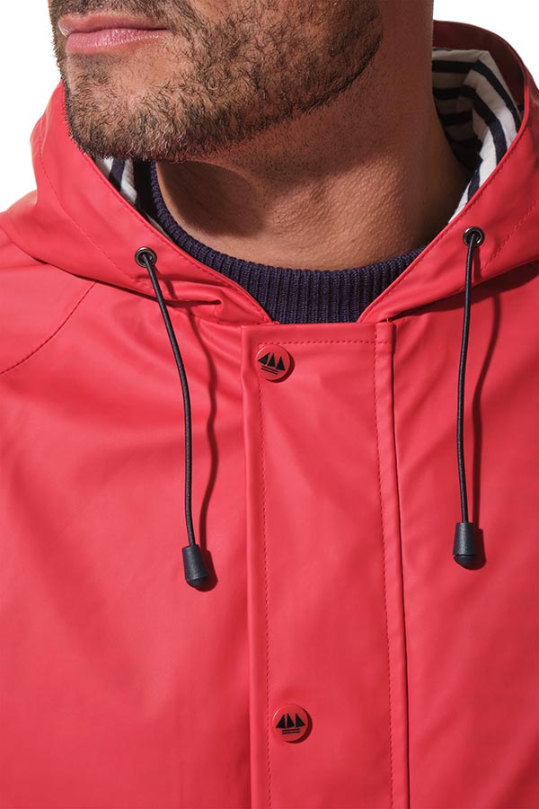 Impermeable estilo pescador de color rojo doblado en su interior. Ligero y confortable, podrás llevarlo a diario o navegando. Doble cierre con cremallera y botones a presión y con su capucha ajustable.