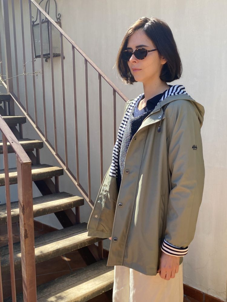 Impermeable estilo pescador de color kaki doblado en su interior. Ligero y confortable, podrás llevarlo a diario o navegando. Doble cierre con cremallera y botones a presión y con su capucha ajustable.