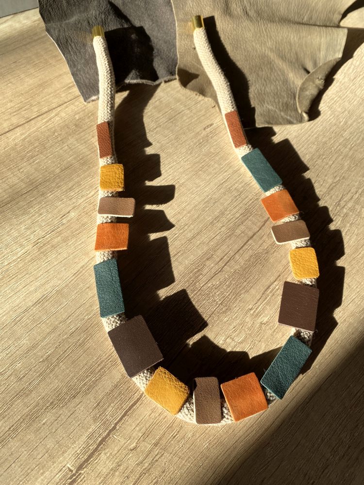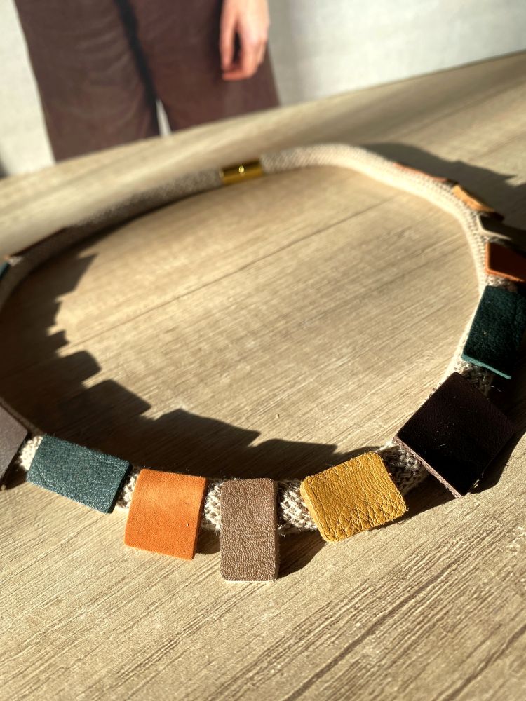 Collar con apliques de piel, súper ligero y cómodo de llevar al tener el cierre de imán hipoalérgico.