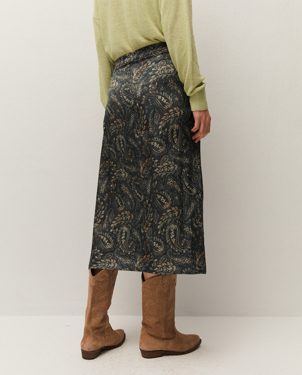 Falda midi evasé de mujer con estampado pashley y con cremallera lateral. Prenda sostenible.