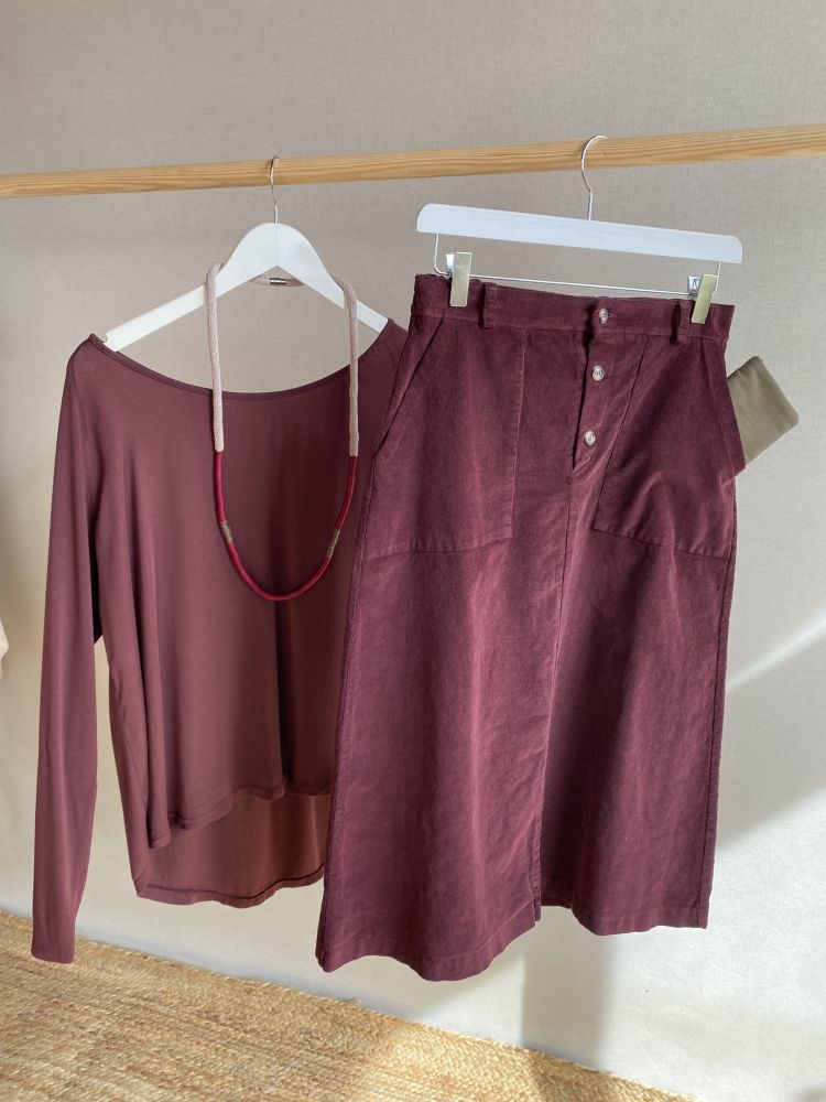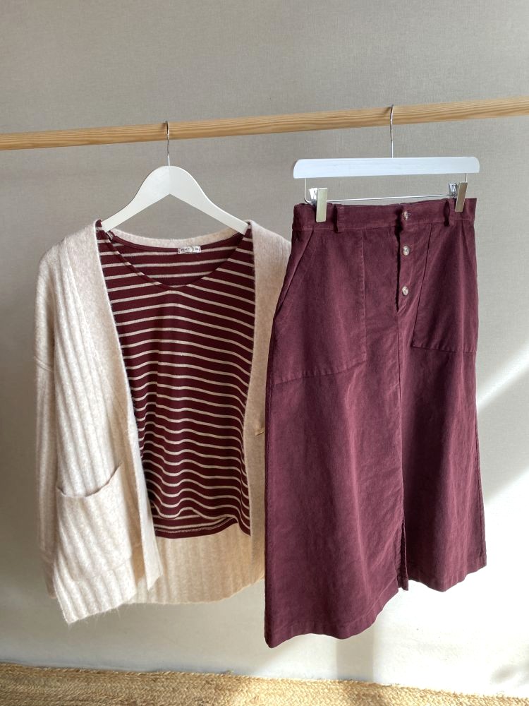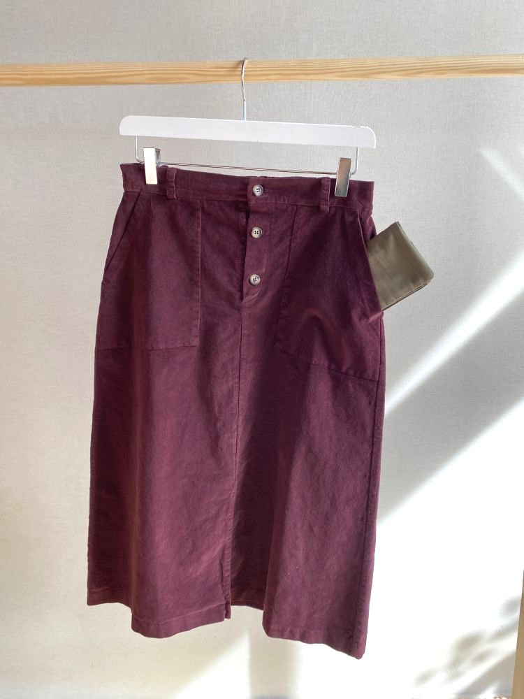 Falda por debajo de la rodilla confeccionada en suave tejido de panaelástico , con bragueta de botones y cinturilla con trabillas para cinturón. Incluye bolsillos laterales grandes y vistos, y una apertura central en el bajo para mayor comodidad y estilo. De tiro medio, combina perfectamente tus looks sencillos que no renuncian al estilo.