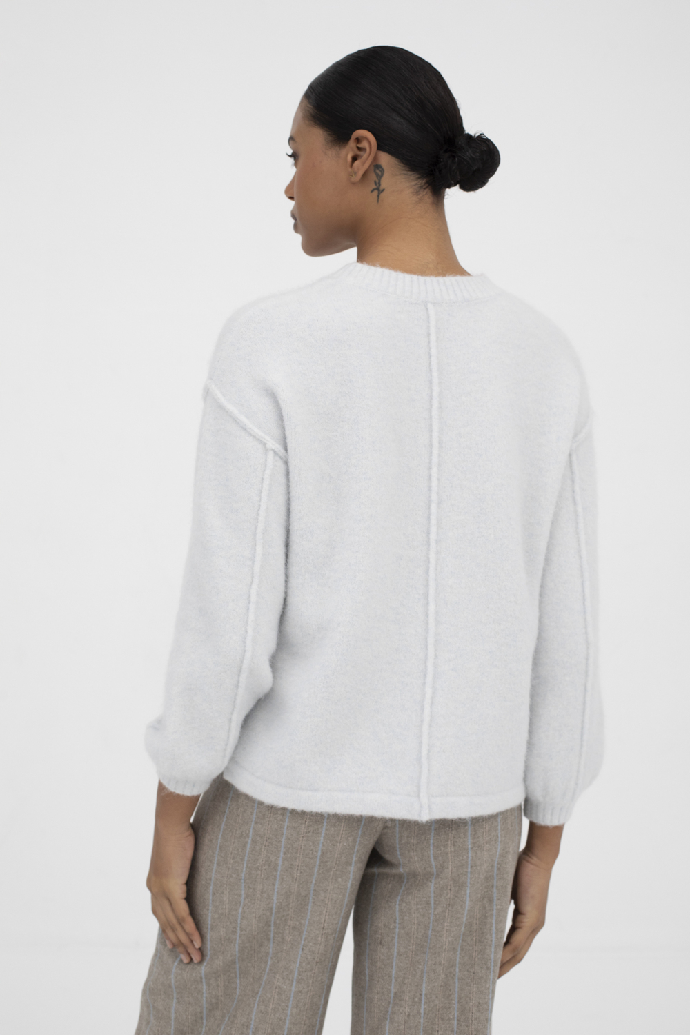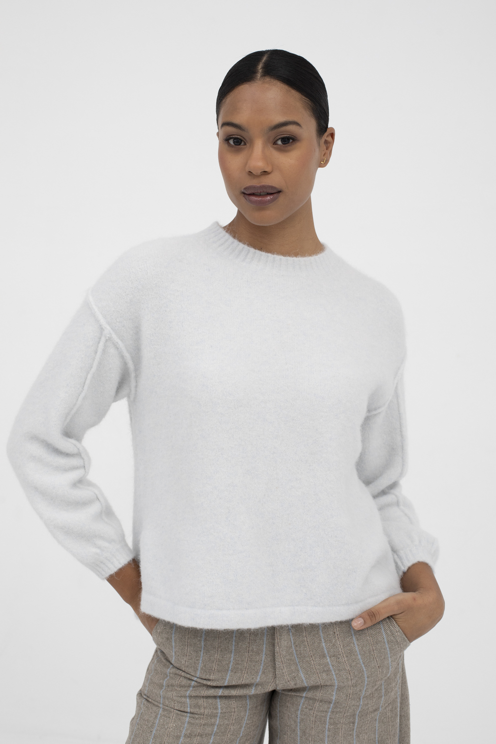 Tiene un detalle de costuras exteriores y acabados en canalé, que le aportan un estilo moderno y elegante.