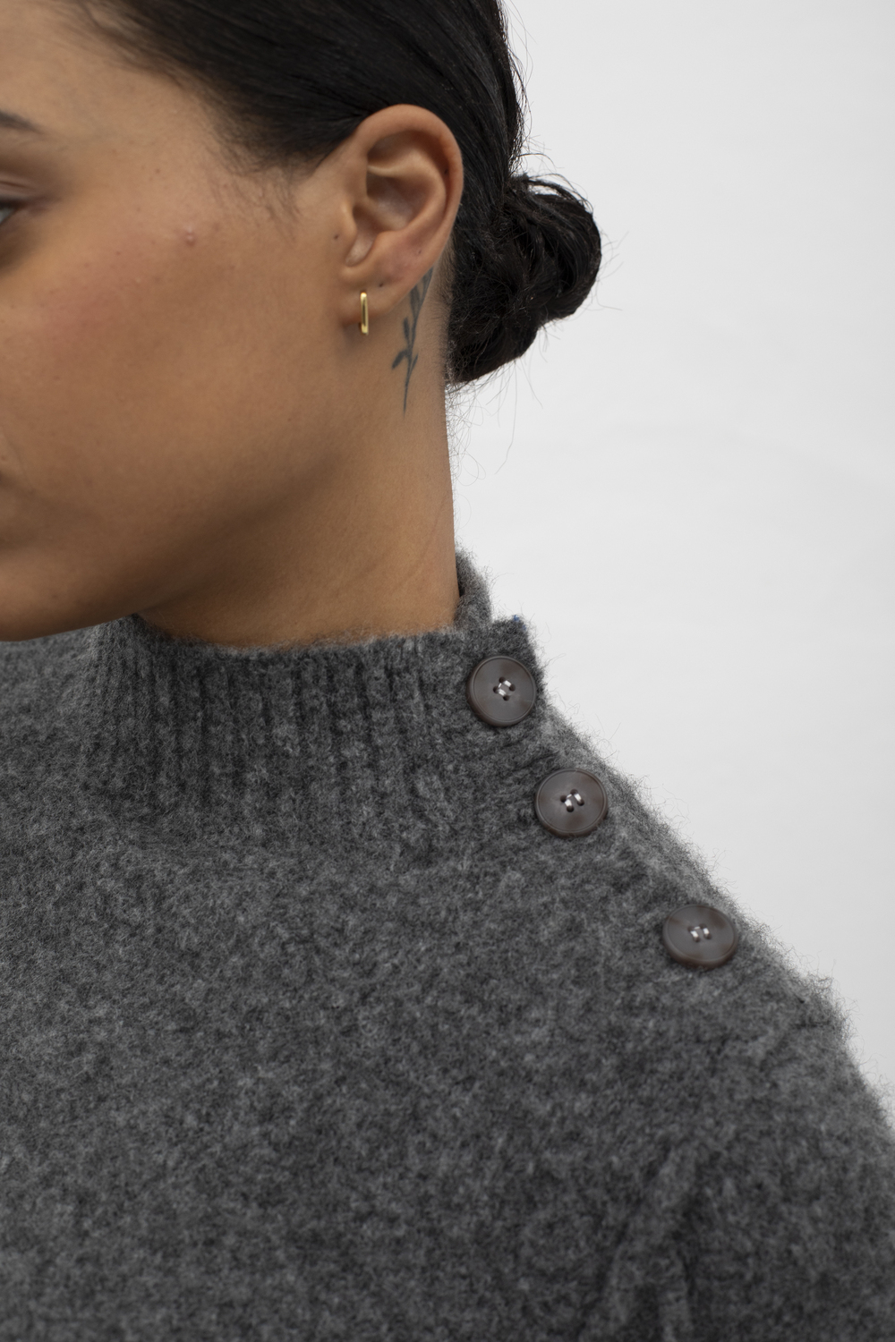 Jersey de manga larga y cuello alto con detalle de botonadura lateral en cuello y hombro.