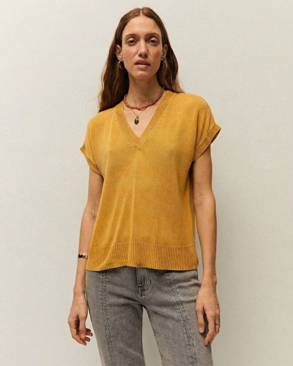 Jersey con cuello pico y manga corta. Tintura corrosiva. Prenda sostenible.