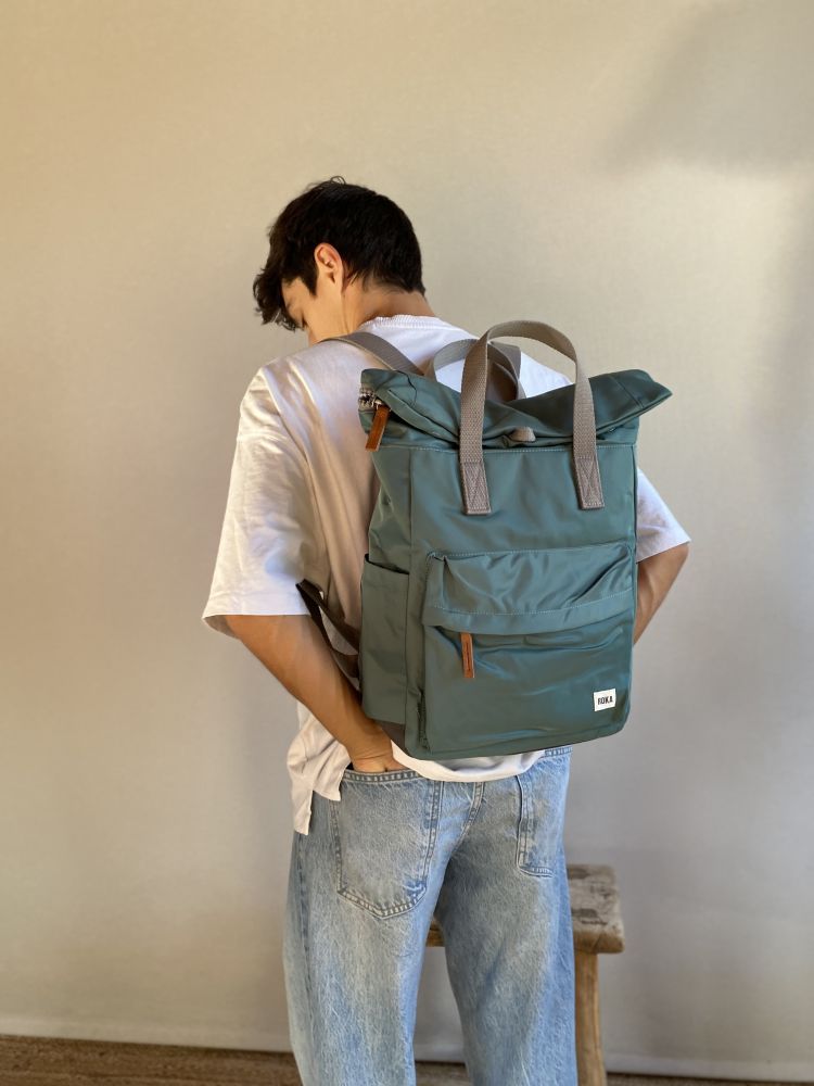 Mochila sostenible, fabricada por 12-13 botellas de plástico recicladas.