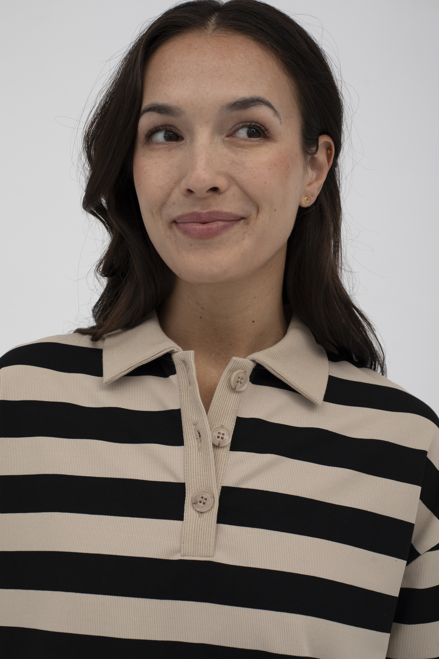 Pedralbes es un polo de rayas anchas y manga larga. Con cuello y tapeta de canalé tipo polo en el mismo tono.
