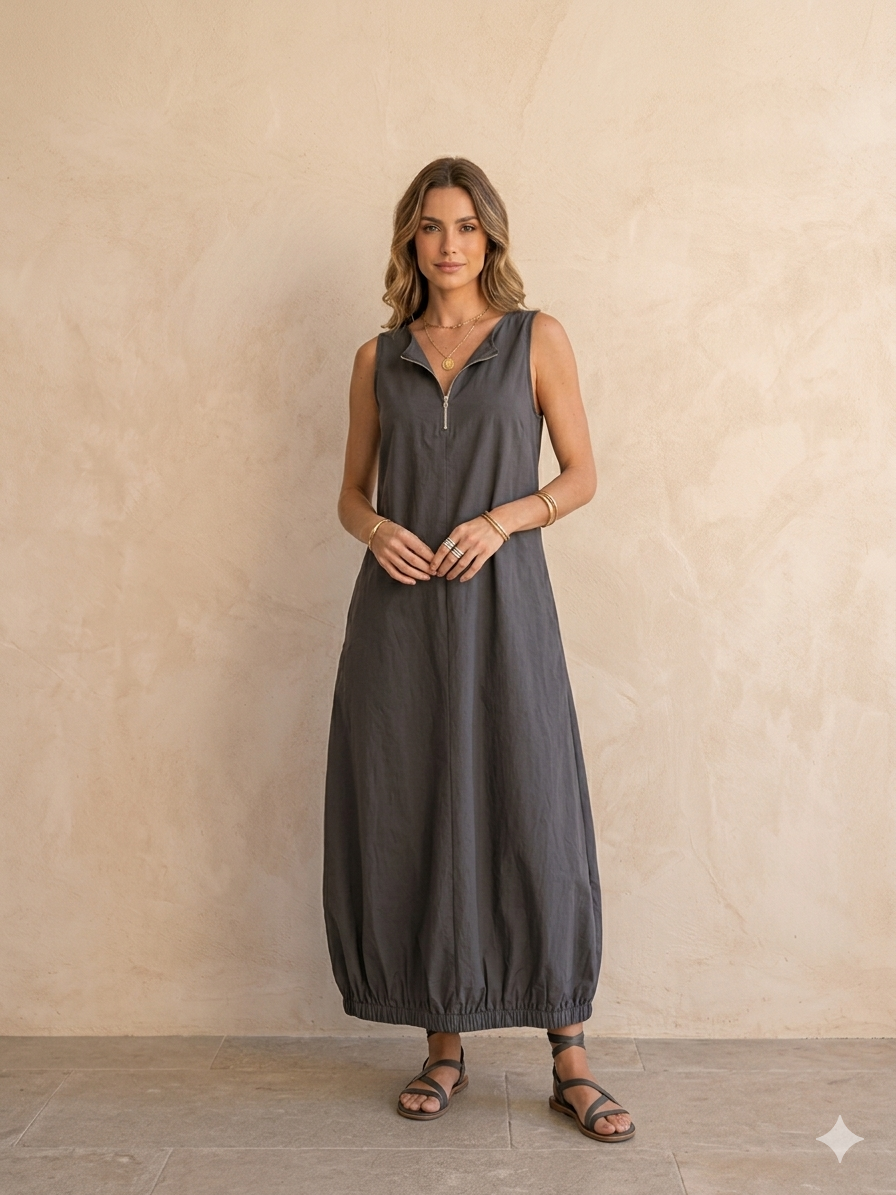 Vestido Globo Plana, largo con escote en pico con cremallera.